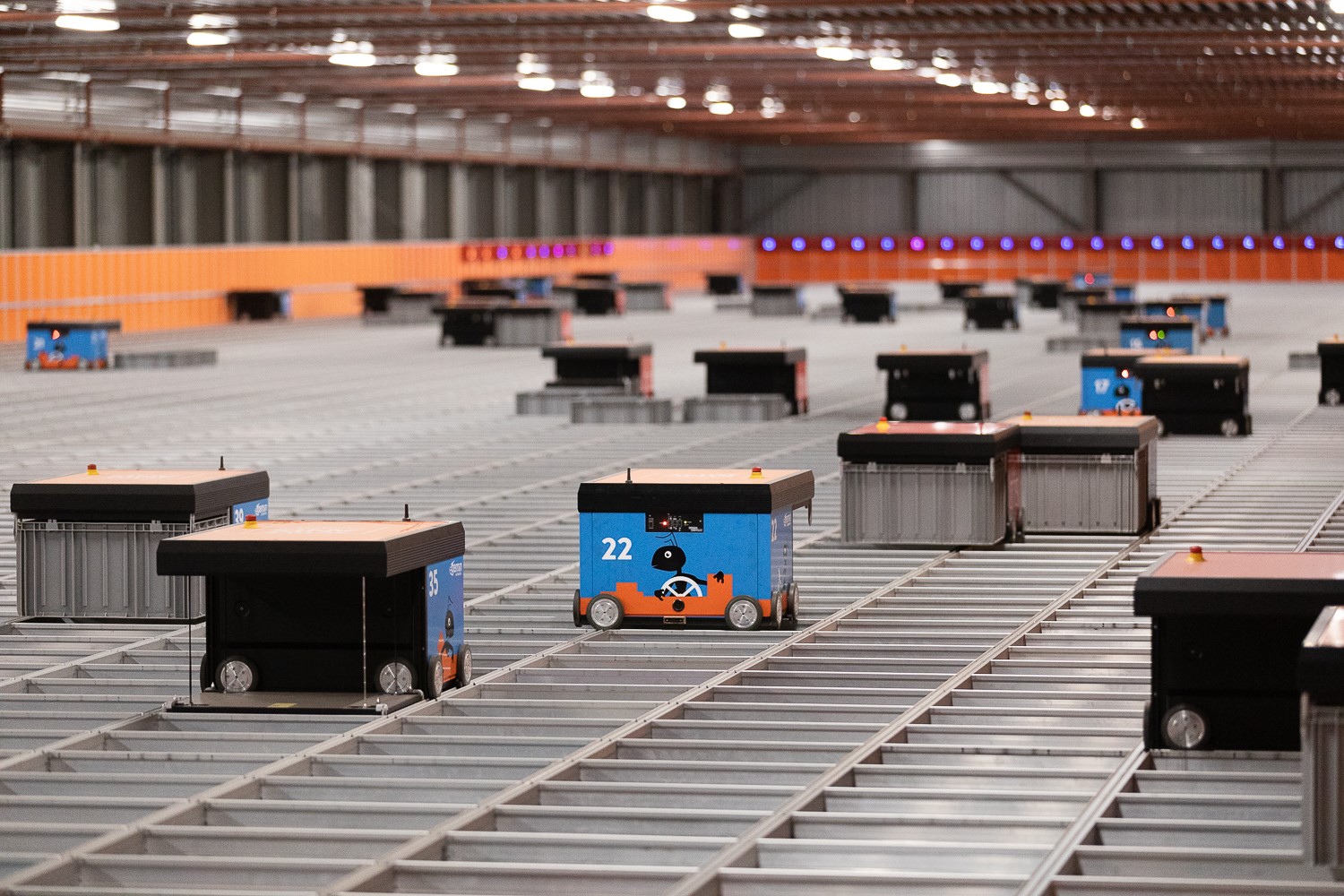 We have two types of robots. A team of floor-based bots which carries products to and from our AutoStore (more on that in minute), while another team of bots picks products.
